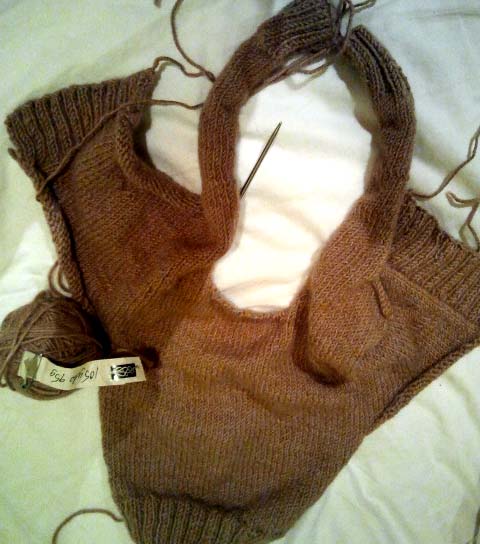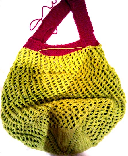 I found this pattern for a market bag on Ravelry and it looked easy enough. Found some cute $2/skein bright green 100% cotton yarn at Michael’s and thought it would be perfect. All was going well until I decided it would be cute with a hot pink handle. Now it looks like something a 12 year old girl would own. So I’m going to take off the pink handle and re-finish it in all green. I’m still debating whether it might be cute if I lined it with some white or black fabric, but then it would lose its stretchiness…