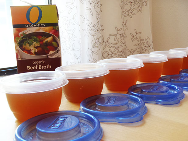 I just line ’em up and pour! Put these individual containers into the freezer overnight and in the morning you’ll have little broth pucks. I pop the broth out of the cups and into a Ziploc bag for freezer storage to save on freezer space and keep everything contained. (TIP: Frozen plastic storage containers crack and break easily. Rather than flexing the plastic to get the broth out, run warm water on the bottom of the container with the lid still on to soften things up a bit).