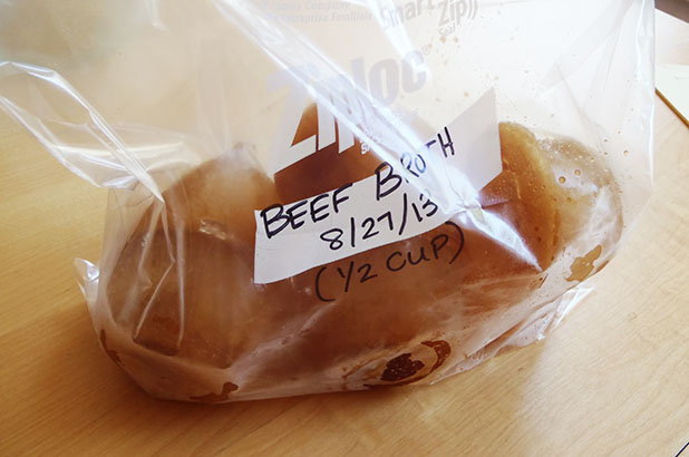 I label the bags with the date I froze the broth and the portion measure. Next time I need a half cup of broth I can just take out a puck instead of thawing the whole batch!!! This works great for other smaller things too. I freeze tomato paste in little 1 Tbsp scoops, and my mom uses her ice cube try to freeze pestos and other herb purees!