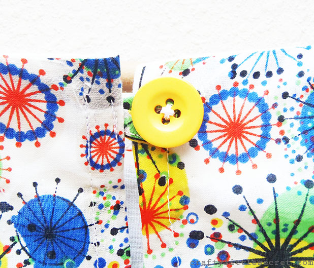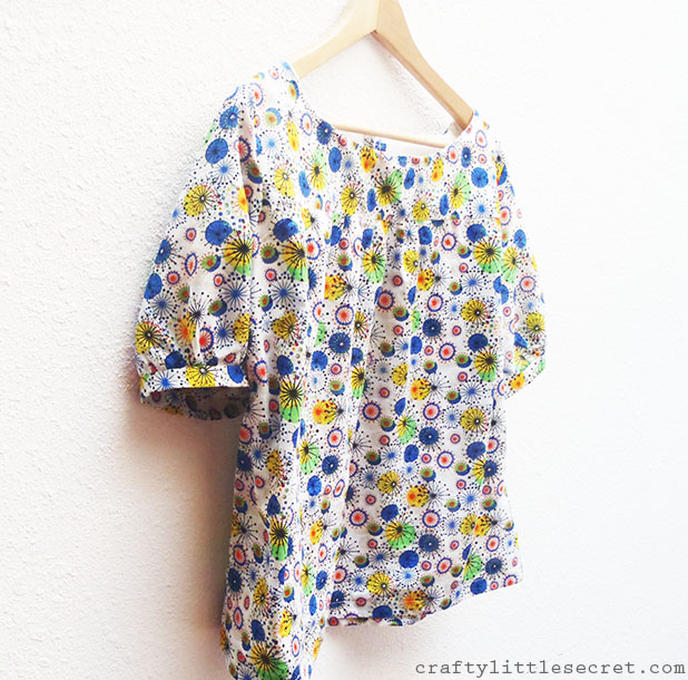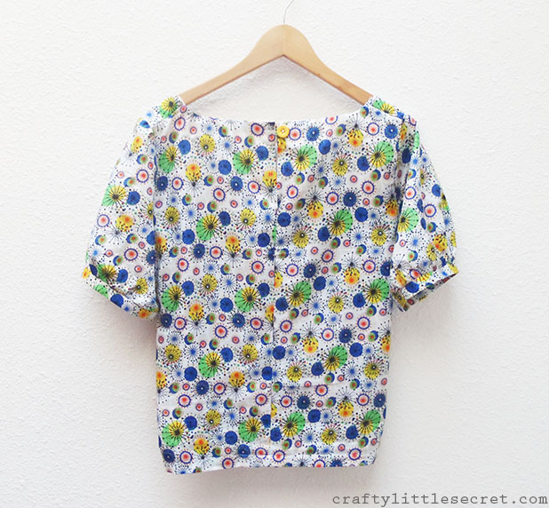 Finally, I also eliminated the back button placket as I did with the last blouse and for the same reason; I thought it would look too busy to have a button placket with such a busy pattern. I left an opening at the top of the back seam and made a button closure, but especially with the lowered neckline, I definitely could have sewn it all the way to the top and still easily fit my head through. The bright yellow button is a cute detail though!