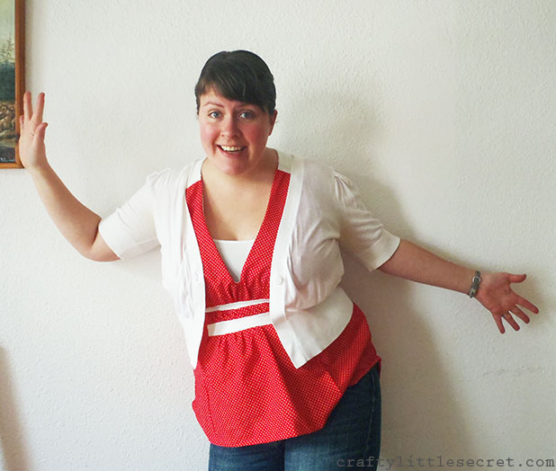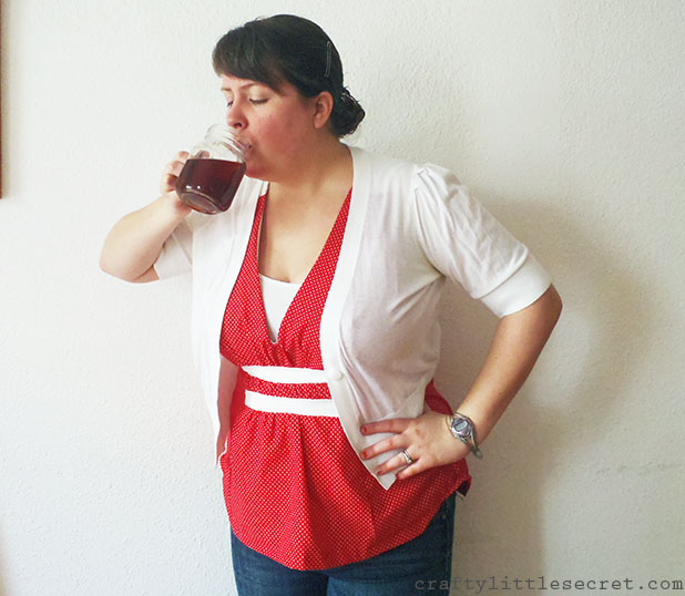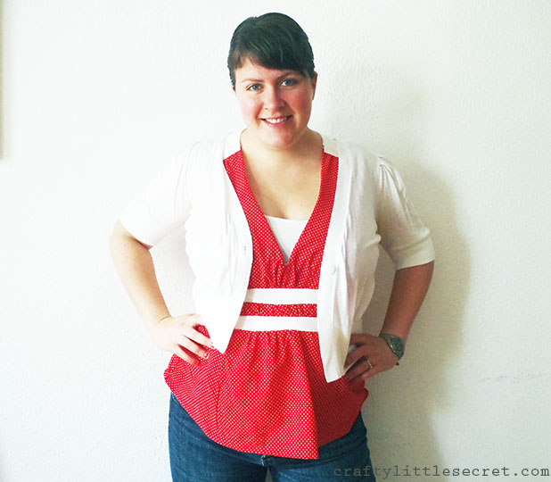 Honestly, although this is technically a wearable muslin I’m not sure how much wear it will actually get. Red is just not a color I wear much and I usually prefer tops with at least a little cap sleeve. Adding a little white cardigan definitely helps with the wearability for me!