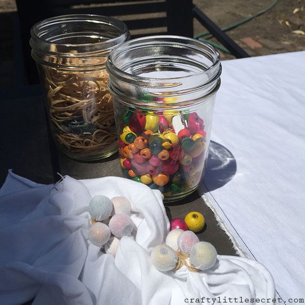 I wrapped the fabric around individual beads in clusters of 4-6, and wrapped each cluster with an elastic.