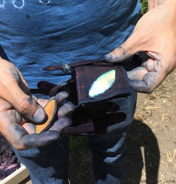 I didn’t catch any pictures of it, but when the fabric comes out of the dye bath it’s actually a lime green color. The deep indigo color develops through an oxidation reaction that occurs once the dye is exposed to the air.