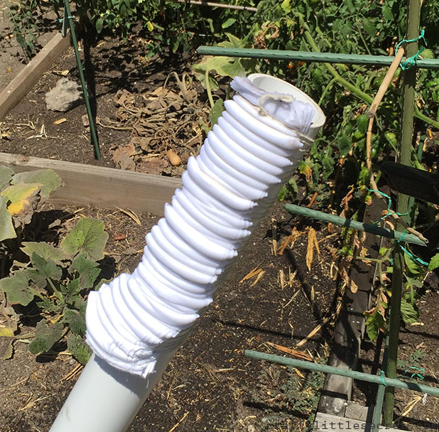 Who knew that indigo dying could be so time-intensive? Turns out that to get that nice deep dark indigo color, you need to dip the fabric multiple times. The exact number of dips depends on the type of fabric, and natural fibers are required. I was using some nice white Robert Kaufman Kona cotton. You start off by soaking the fabric in water for 20 min; this prevents the dye from bleeding through the bound areas of your fabric. You then cycle your fabric, 20 min in the dye, 20 min drying on the line. Repeat until desired color is achieved. I had two pieces of fabric, one tied to either end of the pipe, so I was just flipping the pipe every 20 min.