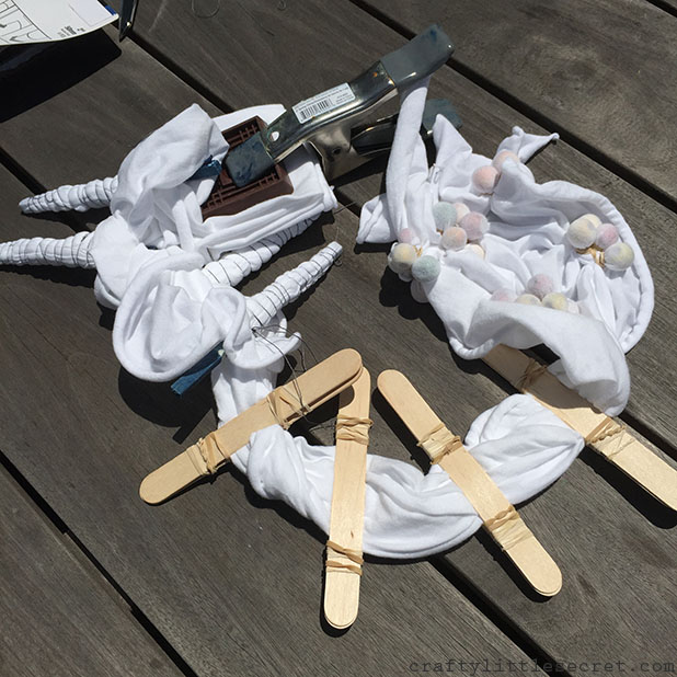 I also tried some popsicle sticks, which I hoped would make stripes, and some plastic furniture coasters held in place with clamps. The tied up cones are a technique known as “kumo” in which the fabric is wrapped around a dowel (or chopstick, in this case) and tied in place using thread or string. Here’s a great example of kumo, that Ryen made: