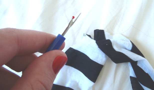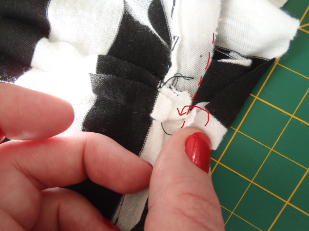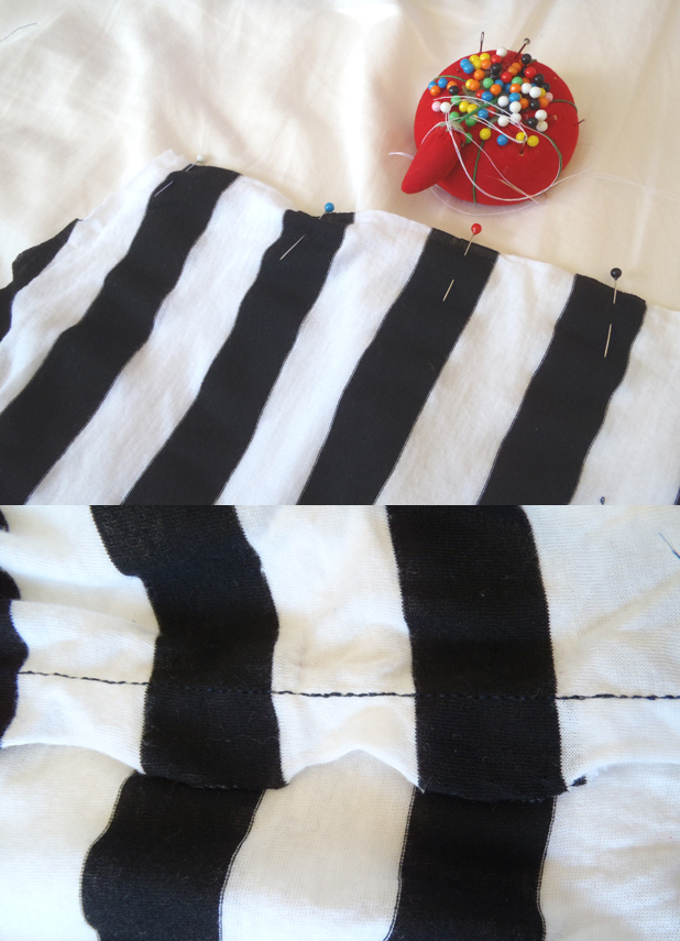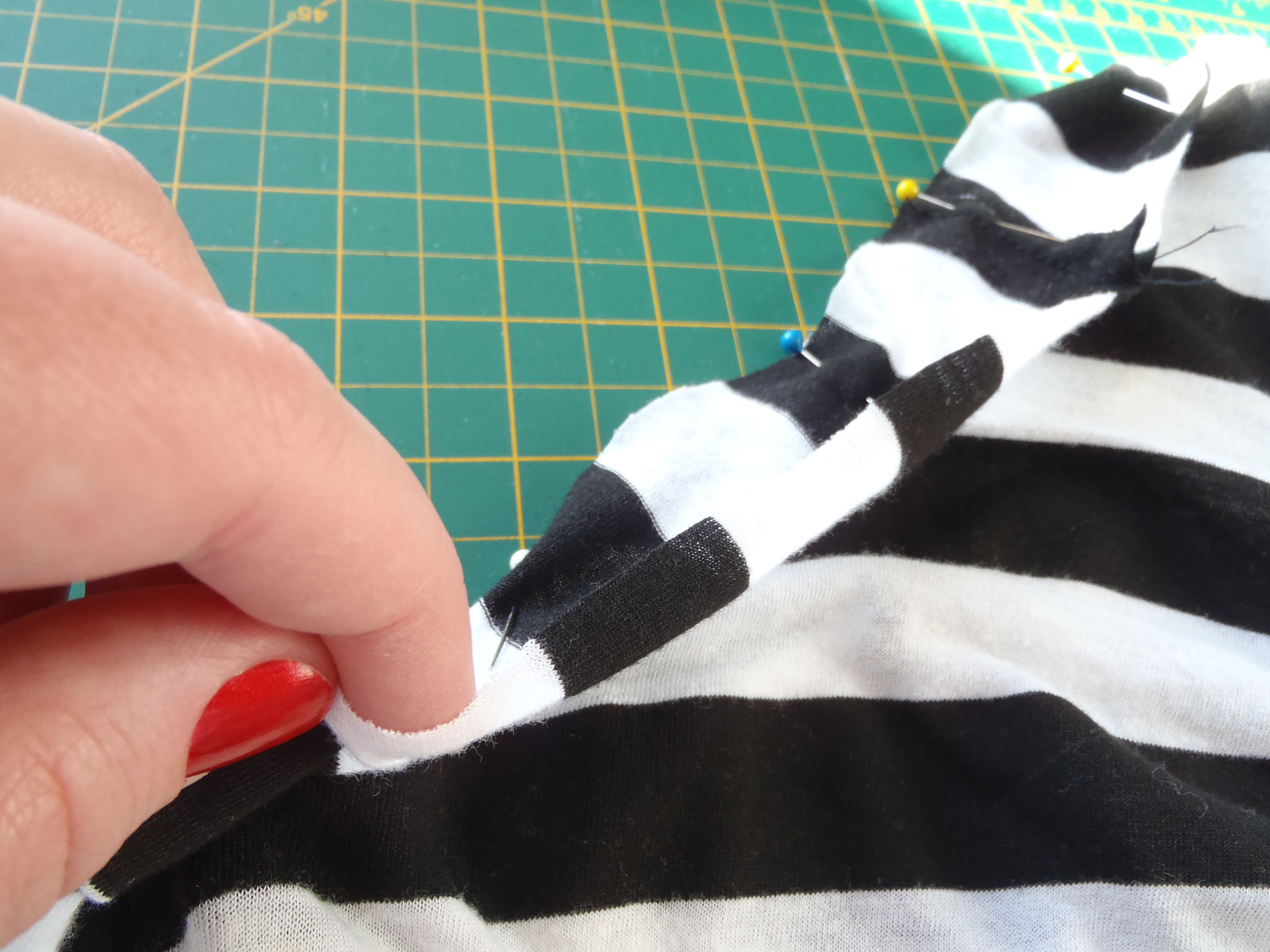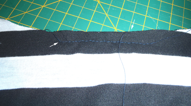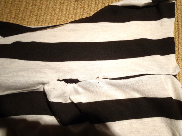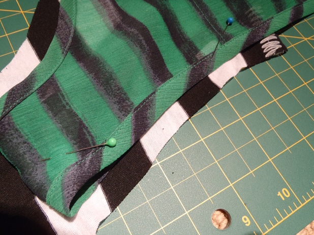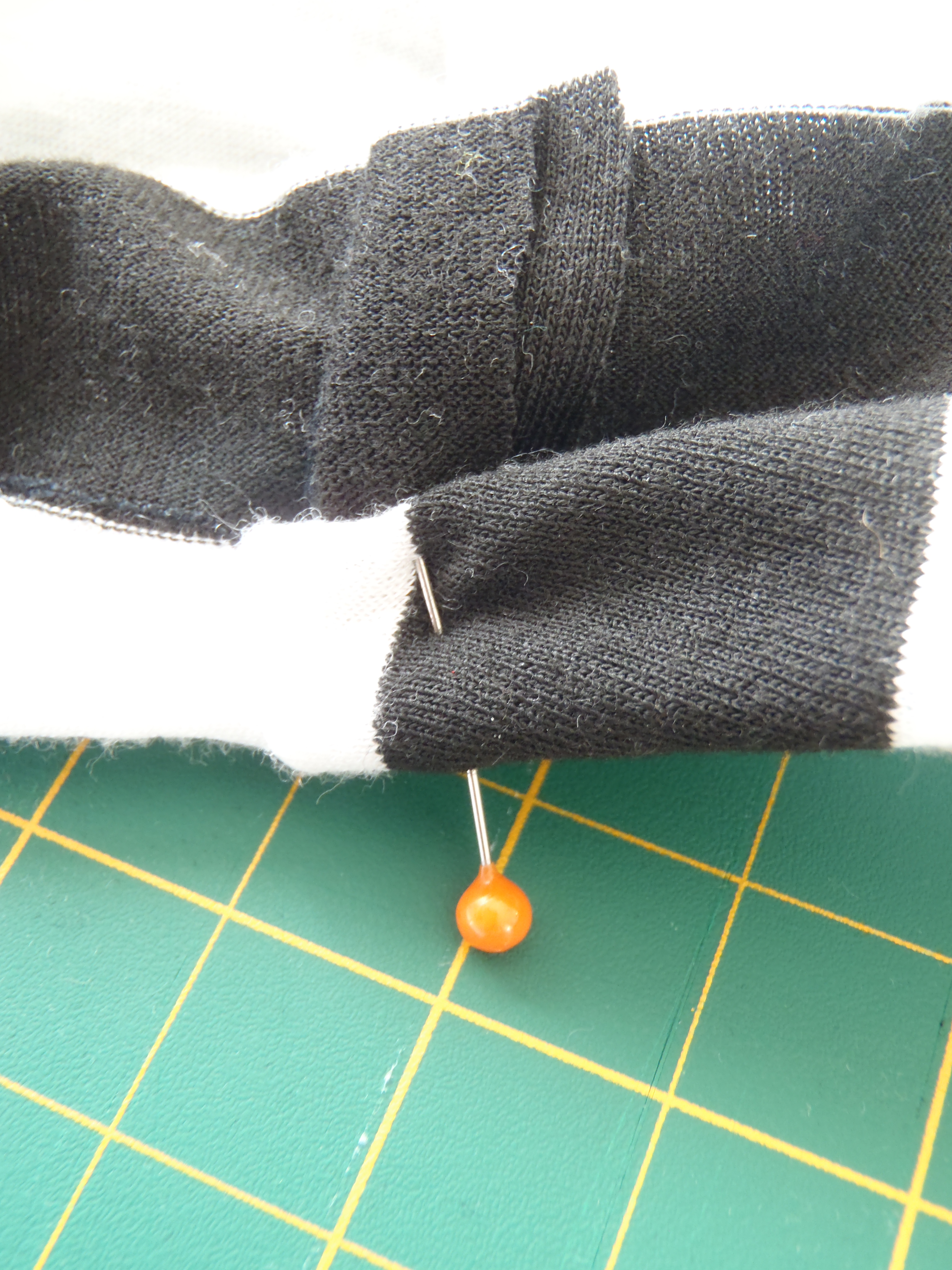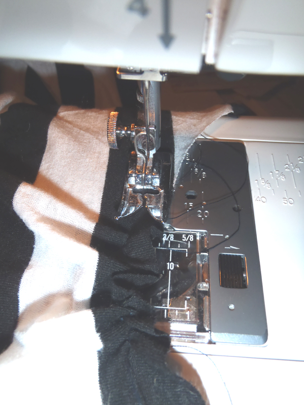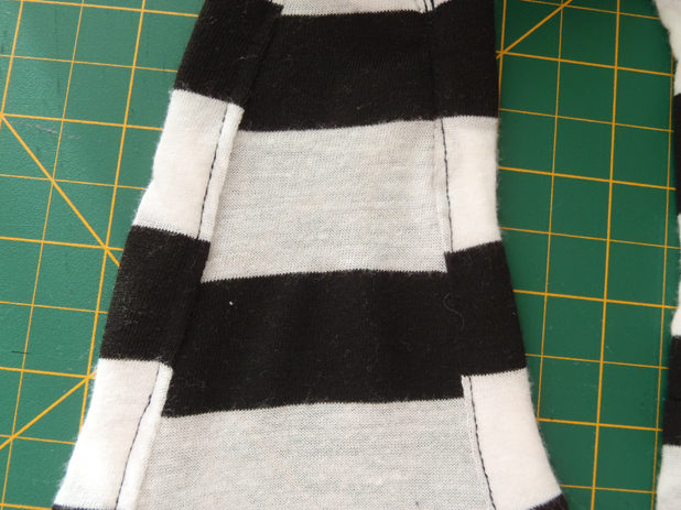 I first sewed together the inseam and the crotch on the legs. When sewing up the crotch I sewed all the way up the back of the onesie but left the front open. I then sewed up the sides of the onesie, extending all the way from leg cuff to sleeve cuff.