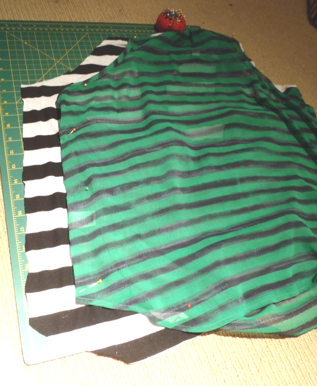 I accordian folded the fabric length-wise so that there were 4 layers of fabric. The patterning was VERY rough. I just laid out a hoodie and a pair of pj pants on top of the fabric and cut around the edges, leaving at least 1″ for seam allowance and a little extra room. I was left with four identical pieces, each making up an ankle-to-neck panel.