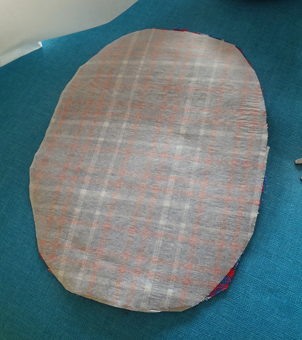 OLYMPUS DIGITAL CAMERAI cut a patch of interfacing about at least a half inch larger than the tear in each dimension. I’ve also found with past experience that round edges are less likely to peel up than sharp corners, so cut out a oval rather than a rectangle.