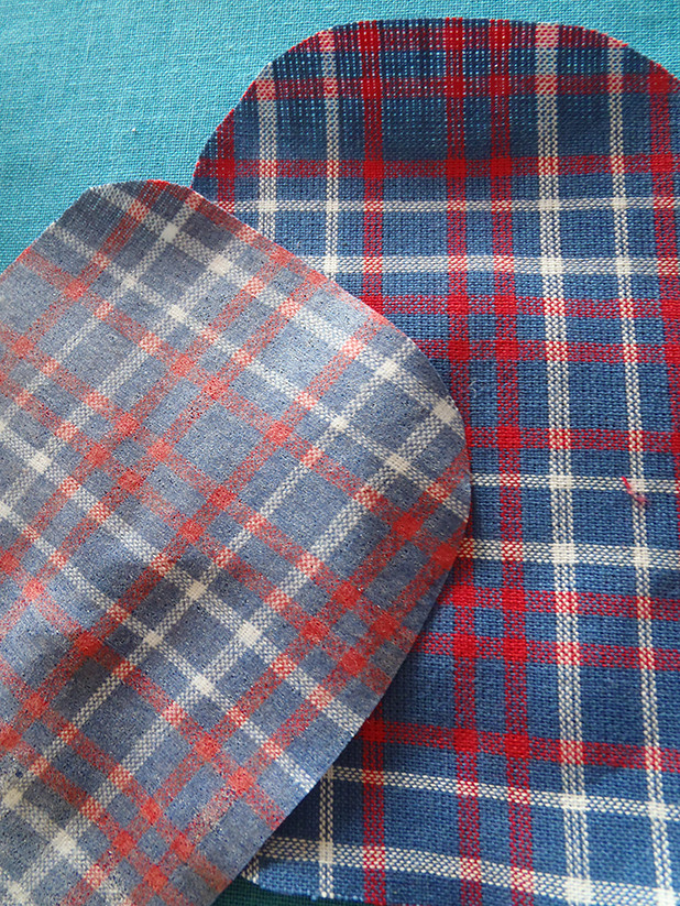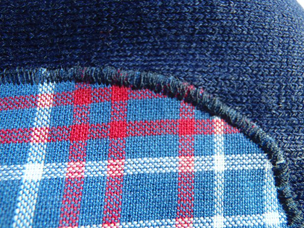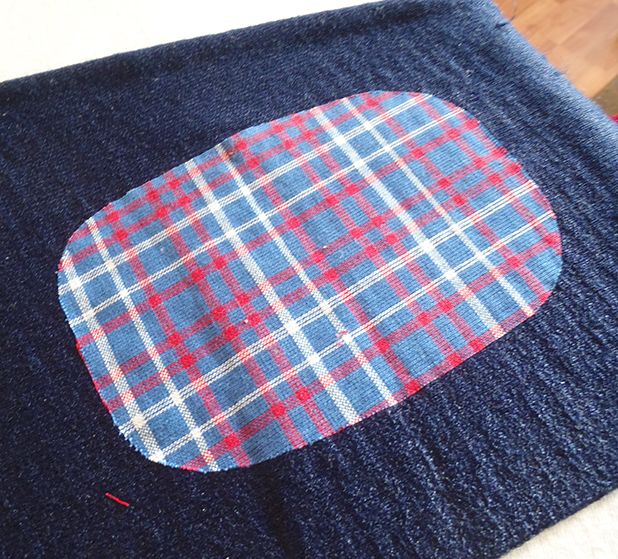 I find that over successive washes, fusible interfacing often starts to peel up off the fabric it was attached to. To try to keep this from happening, I also used tiny stitches around the perimeter of the patch, keeping to the white parts of the pattern to secure the edges of the interfacing and add extra stability (You can just make this out in the picture above).