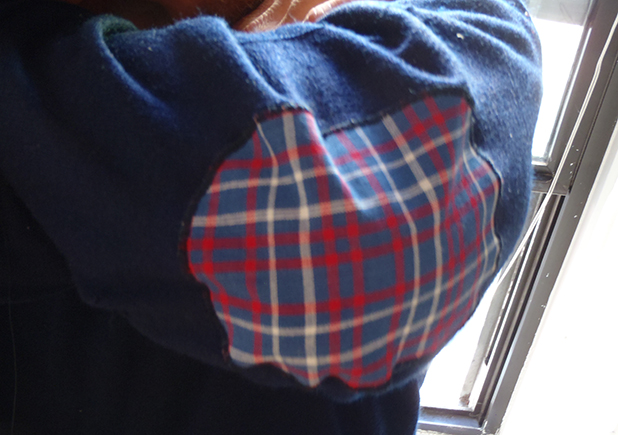 On a trip to NYC Pete saw a dude wearing a sweater with plaid elbow patches and asked if I could do something similar for him. No problem!