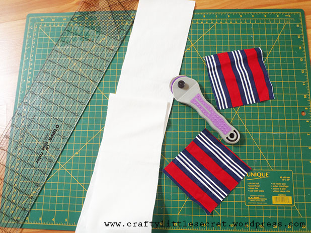 I knew my quilt was going to be a bit smaller than I’d wanted so I purchased some plain white fabric for a border to add size and some nautical striped flannel for the back. Of course, my white fabric was just to short to be able to make a border without cutting separate corner pieces. So, I cut 4 strips of white fabric (4.5″ wide) the length of the quilt, and 4 squares of the striped fabric (4.5″ x 4.5″).