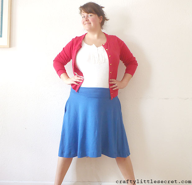 I used about a meter of medium weight cotton knit with two-way stretch to make this skirt and no pattern. I hesitate to call this skirted “self-drafted” because I think that implies that I actually made a pattern instead of just vaguely tracing a skirt shape onto fabric in chalk, quickly sewing it up then trimming away bits as I tried it on. But hey, close enough to “self-drafted”, right?